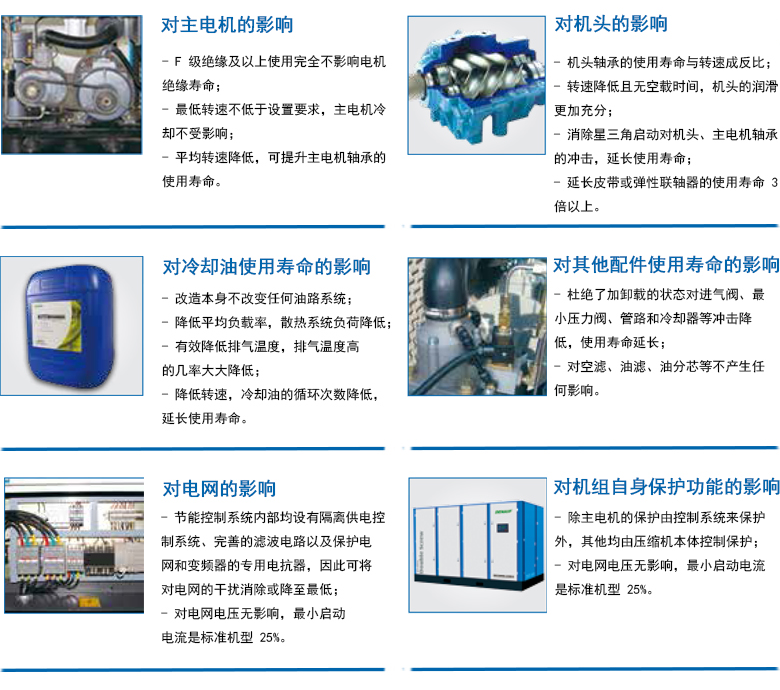 ·变频节能系统采用了变转速控制技术,压缩机的排气 量可以和用户的用气量完美的结合起来,完全避免了卸载 浪费额定功率45%的损耗。运用先进的PLC与PID控制调节, 可以将压力控制在±0.1bar的范围内,始终恒压在6bar状 态下工作,因而更加节能,因为每降低1bar的工作压力, 可以节约7%的能量消耗,所以直接节能14%。另外压缩空 气系统中的泄露也显著减少,如6bar处的泄露要比7bar处 的泄露少15%左右。